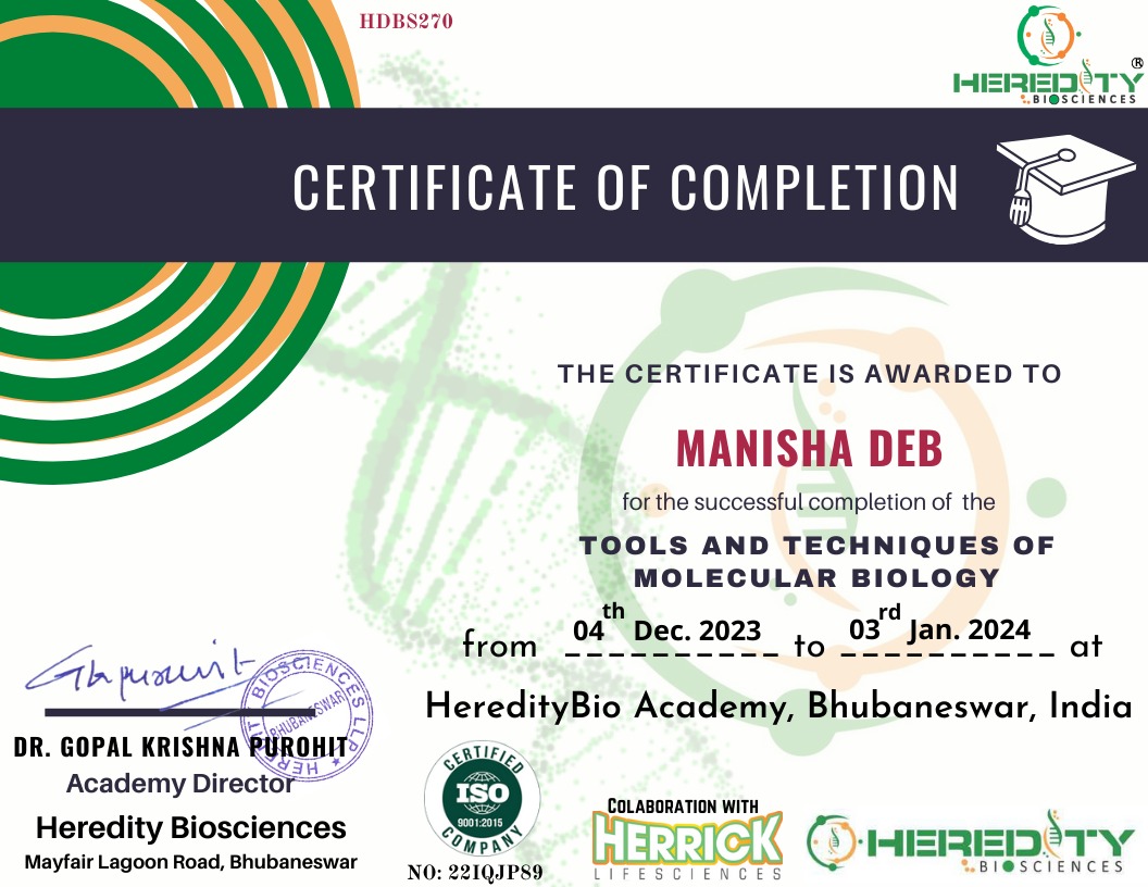 The program is conducted at the Heredity Biosciences laboratory and training facility located in Bhubaneswar, Odisha.